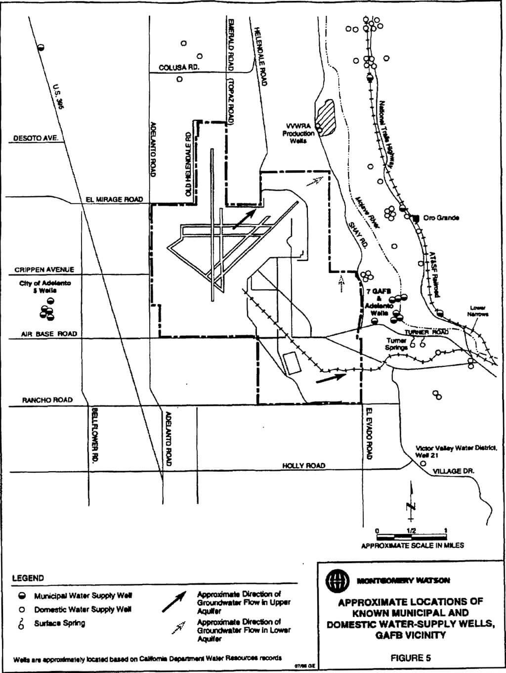 George Air Force Base disposed of Firefighting Foam in Landfill-1 (L-1). Landfill-1 is located south of Air Base Road in the Southeast Disposal Area (SEDA) and about a ¼ mile upstream of the old Drinking Water Supply Wells for George AFB, Adelanto, CA, several homes, and the former Victor Valley Country Club. Unfortunately, the groundwater flows northeast from the SEDA directly toward these drinking water supply wells creating a potential Completed Exposure Pathway (CEP) for PFOA and PFOS to tens of thousands of civilians, and military personnel and their family members (spouses, children, and developing fetuses) over the years.